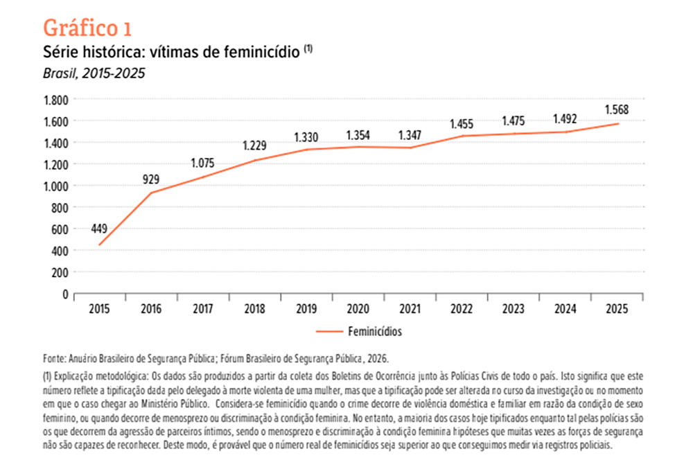 Dados do documento “Retratos do Feminicídio no Brasil – 2006/2026”, do Fórum Brasileiro de Segurança Pública, revelam que, só no ano passado, 1.568 mulheres foram vítimas desse crime no País, um crescimento de 4,7% em relação ao ano anterior.
